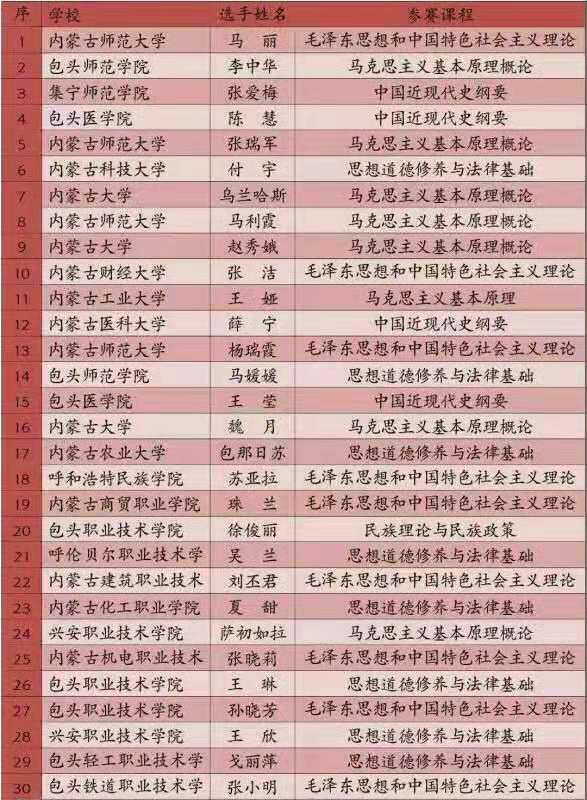 12月9日,内蒙古自治区教育厅、内蒙古自治区总工会、内蒙古自治区人力资源和社会保障厅联合主办的“全区高校思政课程和课程思政教学技能大赛”在内蒙古大学落下帷幕。本次大赛历经学校初赛、内蒙古高校易班平台评审,从210名参赛选手中评选出思政课程教师30名,课程思政教师18名进入最终的决赛。自治区本科院校共有18名选手进入决赛,我校taptap点点官网张瑞军、马丽、马利霞、杨瑞霞四名青年教师入围,入围人数全区第一。