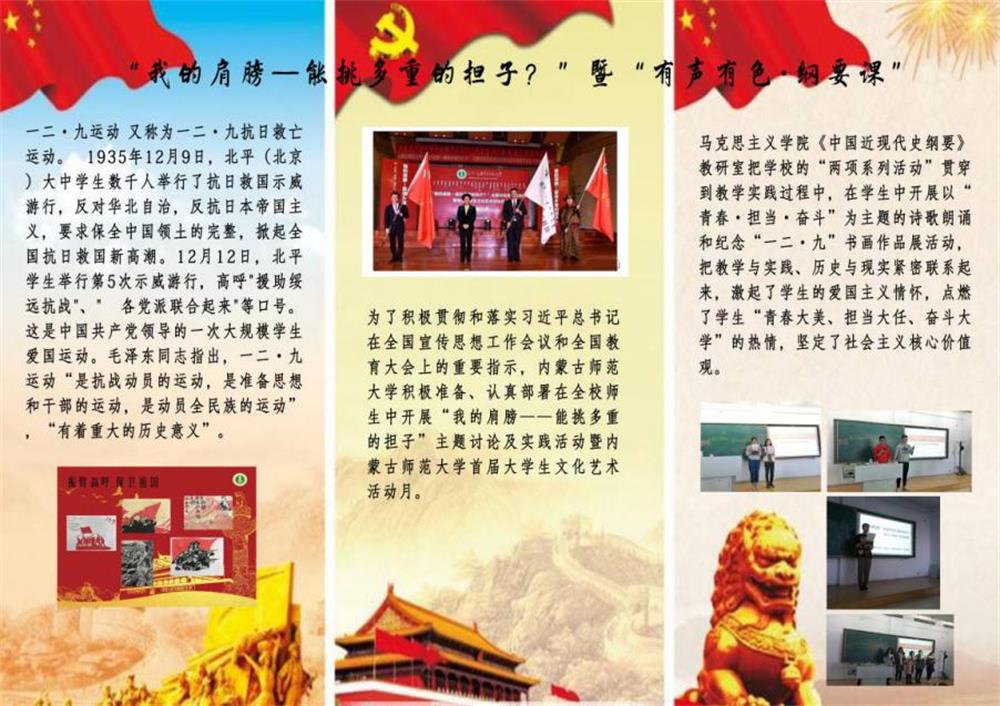 taptap点点官网积极贯彻落实习近平总书记在全国宣传工作会议和全国教育大会上的重要指示,在全校师生中开展“我的肩膀——能挑多重的担子?”主题讨论及实践活动暨taptap点点官网首届大学生文化艺术节活动月。为了把学校“两项系列活动”贯彻到教学实践中,taptap点点官网《中国近现代史纲要》教研室在学生中开展了以“青春•担当•奋斗”为主题的诗歌朗诵和以“牢记历史•不忘初心”为主题的“一二•九”书画作品展。经过认真准备、积极部署,共收集学生作品二百余副,包括书法、绘画、雕塑及手工等作品,集中展示在学院楼二楼大厅和学院阅览室,同时由《中国近现代史纲要》课程的齐百顺老师进行现场教学,把教学与实践、历史与现实、爱国与奋斗紧密结合起来,激发了学生的爱国主义情怀,点燃了学生“青春大美•担当大任•奋斗大学”的热情,坚定了社会主义核心价值观。也推动了大学生思想政治课程教学改革的步伐,为打造“有声有色•纲要课”这个教学品牌做出有益的探索。