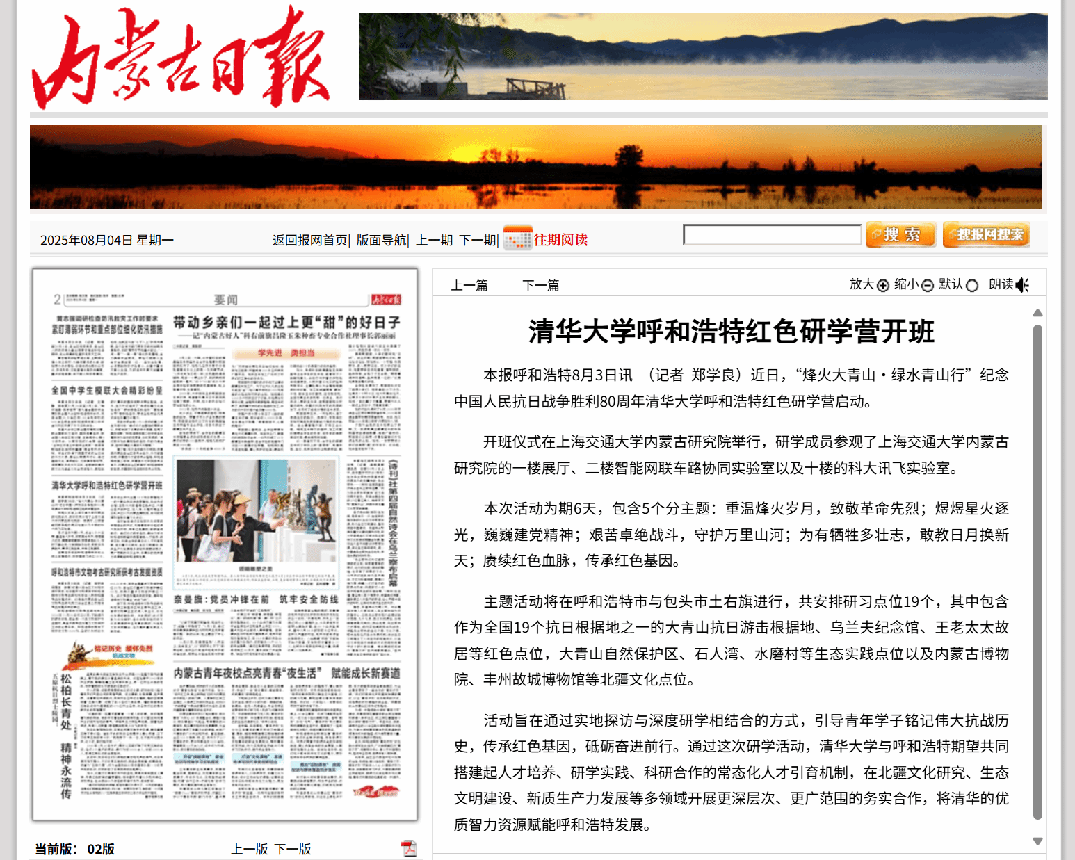 7月31日至8月5日,“烽火大青山・绿水青山行”纪念中国人民抗日战争胜利暨世界反法西斯战争胜利80周年清华大学呼和浩特红色研学营顺利开展。此次研学活动由呼和浩特市社会科学联合会、清华大学日新书院联合主办,taptap点点官网、上海交通大学内蒙古研究院等单位协办。本次活动为期6天,包括5个分主题,在呼和浩特市与包头市土右旗的19个研习点位开展,旨在引导青年学子铭记抗战历史、传承红色基因,推动清华大学与呼和浩特在人才培养、科研合作等领域的深度联动。