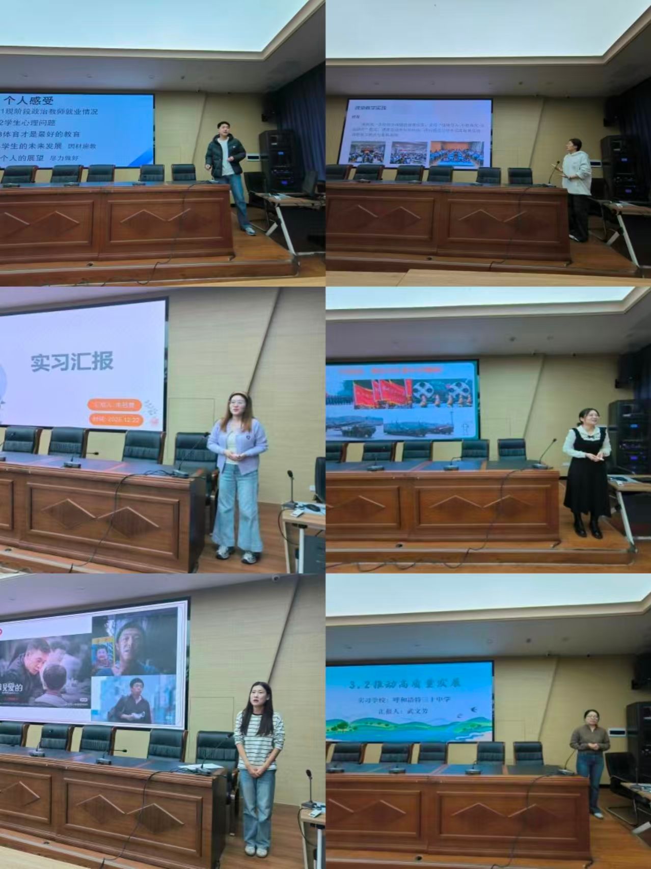总结大会上,6 名实习生代表依次作实习成果汇报。李玉同学从听课观摩、课堂授课、班主任工作实践等方面,系统分享了在taptap点点官网附属第二中学的实习体会与成长感悟;张秀怡同学结合在呼和浩特市第一中学的实习经历,聚焦教学反思展开交流,提出思政课应兼具理论深度与情感温度的核心观点;朱若晨同学详细介绍了在实验中学鼓楼校区参与集体备课、教研研讨及主题班会组织等多元实践的收获与思考;赵亚芹、刘阳、武文芳三位同学分别围绕 “自强不息”“公民基本权利”“新发展理念” 主题进行教学片段展示,充分展现出扎实的教学设计功底与娴熟的课堂实践能力。