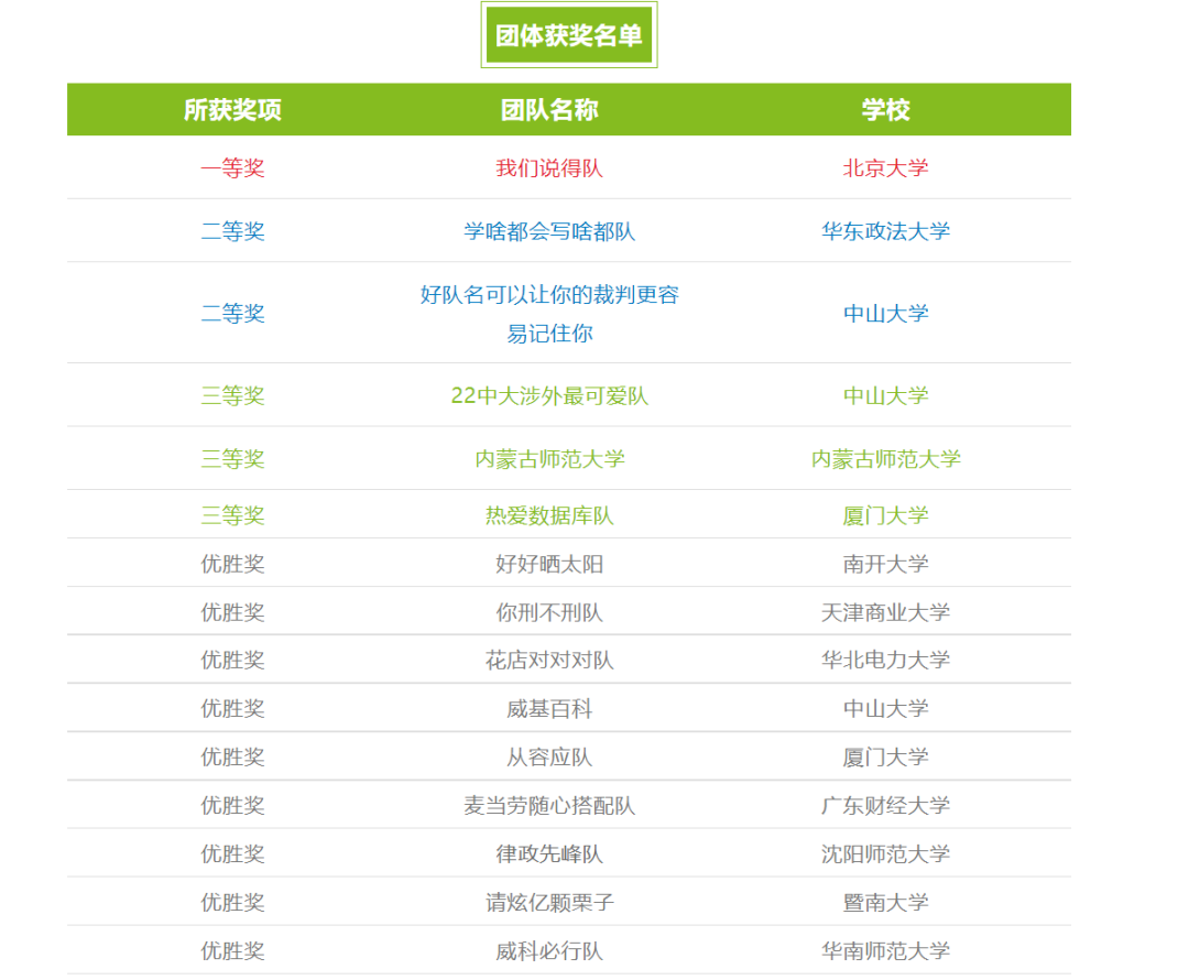 经过激烈比拼,在核算四轮综合得分后,大赛桂冠花落北京大学“我们说得队”。亚军被来自华东政法大学的“学啥都会写啥都队”和来自中山大学的“好队名可以让你的裁判更容易记住你”队揽获。来自中山大学的“22中大涉外最可爱队”、taptap点点官网的“taptap点点官网队”及来自厦门大学的“热爱数据库队”则获得季军殊荣。