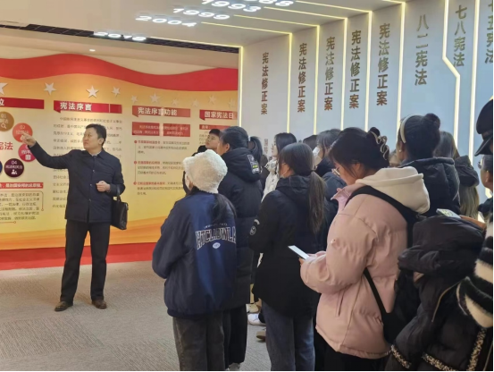 宣誓完毕,老师带领同学们前往厅外的走廊,这里全方位的展现了我国宪法的发展史,金阿拉坦苏和老师结合图文资料,用丰富的宪法专业知识,详细地向同学们介绍了我国宪法筚路蓝缕的发展和法治强国建设的累累硕果,进一步引发同学们对宪法的思考与讨论。在返程之际,大家一同在展览厅门前进行了合影,记录这收获满满的一天。