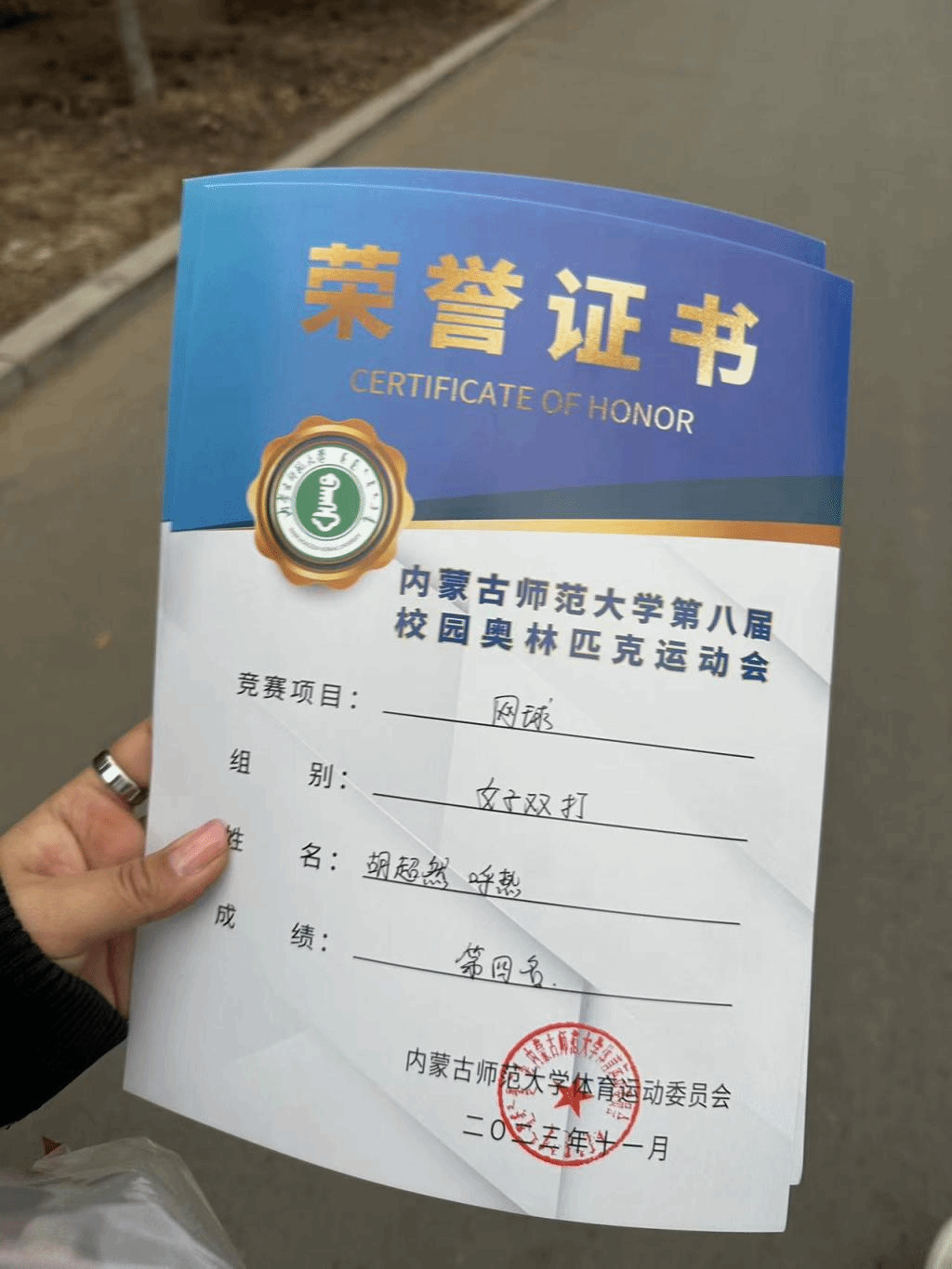 我班胡超然同学在taptap点点官网第八届奥林匹克运动会网球女子双打中获得第四名